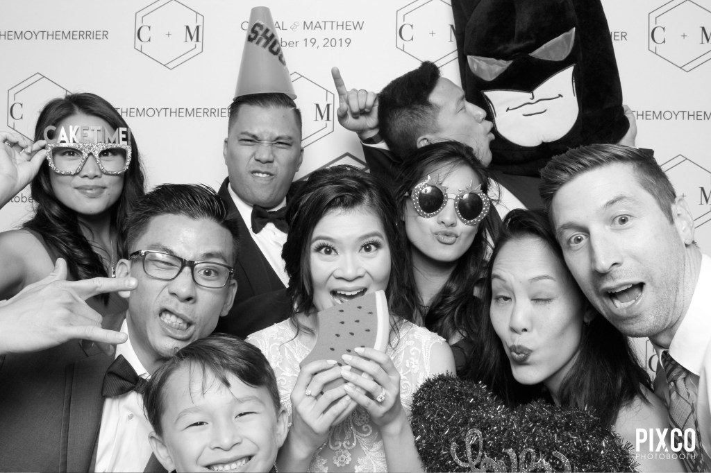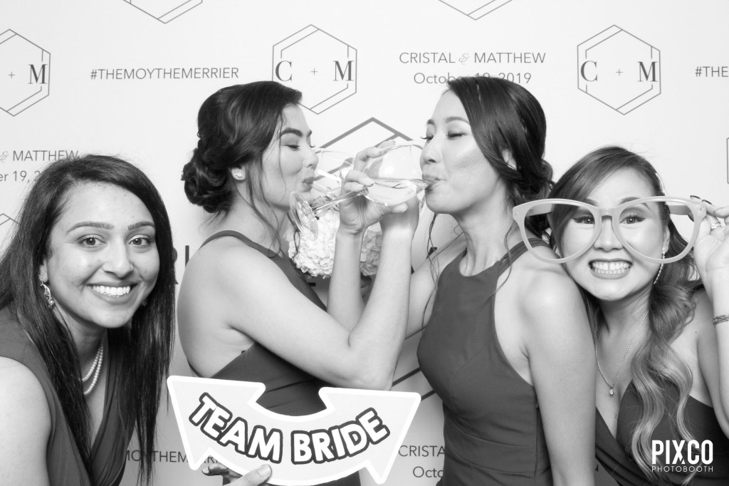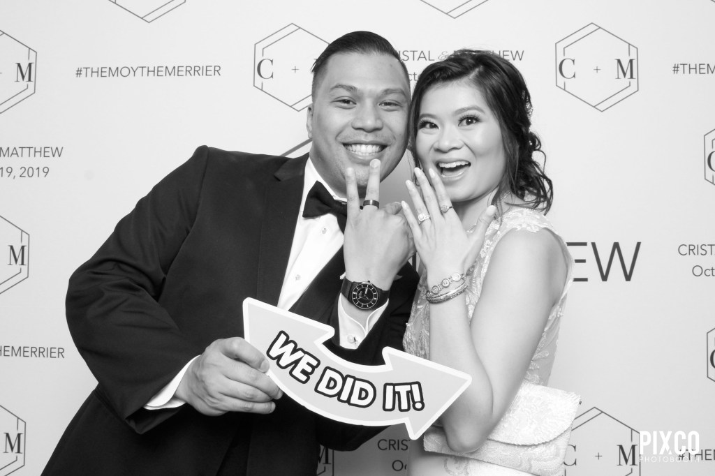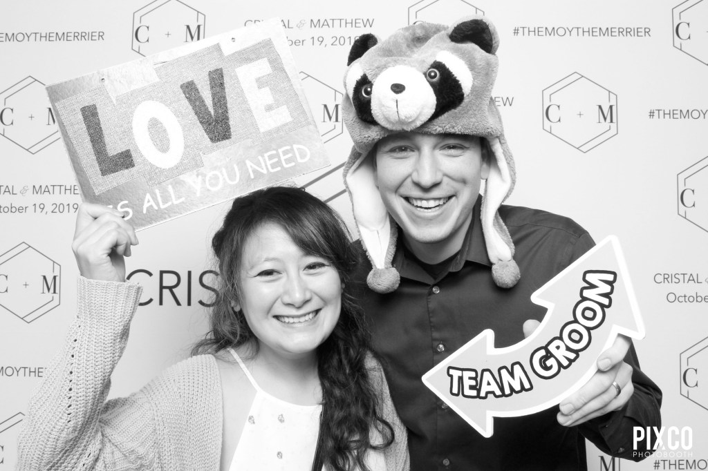 For their wedding, we have a Custom Backdrop – complete with Cristal & Matt’s wedding date and their wedding hashtag, it made the perfect background for their photobooth shots! Matching their wedding theme and colors for their Custom Design Photobooth Template and a Glam Filter upgrade to which a skin-softening and made in the high key black and white filter.